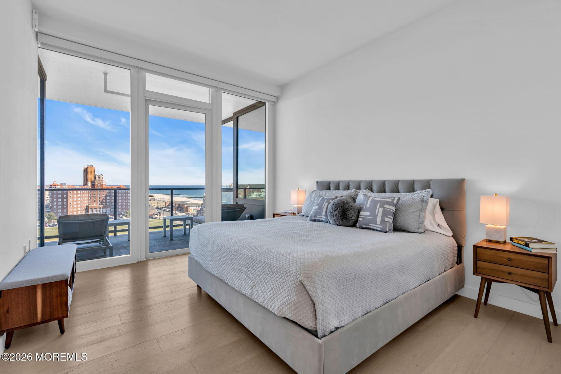There are addresses in Asbury Park where you can feel the city's creative pulse the moment you step inside, and Residence 1009 at the Asbury Ocean Club is one of them. Perched on the tenth floor of this iconic oceanfront tower, this two-bedroom, two-bath home faces north, framing a view that stretches from Convention Hall and the historic Berkeley Hotel along the coastline to the open Atlantic - a panorama that greets you from the kitchen, the living room, the dining table, and both bedrooms before you've even had your morning coffee. And unlike most residences in the building, this one comes with a separately deeded storage unit - a rare inclusion that buyers here know to look for.The layout is open and effortless, designed for people who love to live well and entertain easily. The kitchen anchors it all - a sculptural calacatta slab backsplash, Miele appliances, an oversized waterfall island, and integrated cabinetry that keeps everything clean and purposeful. Floor-to-ceiling windows flood the living and dining areas with light, and the wide-plank white oak floors run seamlessly throughout, giving the entire residence a quiet, gallery-like calm.The split bedroom layout offers the privacy you'd expect from a home of this caliber. The primary suite opens directly onto the private wraparound terrace, where a chaise lounge and the sound of the ocean make the morning feel unhurried. Its bath is all marble - floor to ceiling - with a double-sink floating vanity, a generous walk-in shower, and Asbury Ocean Club-branded towels that remind you exactly what kind of place you've chosen to call home. The second bedroom is equally well-appointed, with its own balcony access and an en-suite bath featuring a striking ocean blue hex mosaic tile - the one splash of color in an otherwise serene, all-white palette.Beyond the front door, the Asbury Ocean Club delivers what very few addresses can. A rooftop infinity-edge pool with ocean views. A world-class fitness facility. A spa. A private movie theatre. A lounge, a bar, conference rooms, and 24-hour concierge service - all accessible to residents. The beach and boardwalk are steps away, Convention Hall is in your sightline, and the restaurants, galleries, and energy that have made Asbury Park one of the most talked-about destinations on the East Coast are right outside.This is coastal living without compromise - sophisticated, turnkey, and completely alive.