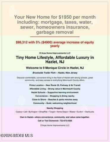 Welcome to this beautifully updated and move-in ready manufactured home in the heart of Hazlet! This charming 2-bedroom, 1-bath residence offers a perfect blend of modern finishes and comfortable living. Step inside to find a bright and inviting interior featuring updated flooring, fresh paint, and stylish fixtures throughout. The renovated kitchen showcases sleek cabinetry, ample counter space, and a clean, contemporary design ideal for everyday living. The spacious bedrooms offer great natural light and generous closet space, while the updated bathroom features modern tilework and finishes. Enjoy outdoor living with a private yard area perfect for relaxing or entertaining. Conveniently located just minutes from major transportation, shopping, dining, and the Jersey Shore, this home is ideal for commuters or anyone looking to enjoy all that Hazlet has to offer. A wonderful opportunity for low-maintenance living in a prime location-don't miss it!